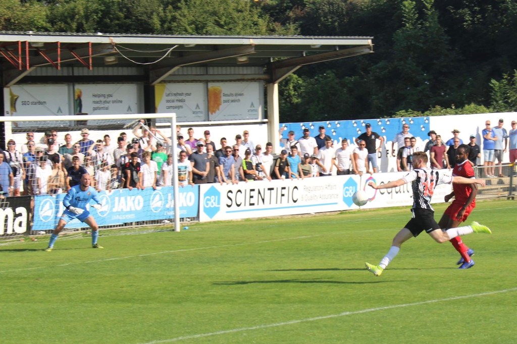 Only a few minutes later, Maidenhead were shouting for a penalty after a bad tackle on James Akintunde but after the referee waving it away, the score was still 0-0 until Joe Ellul knocked one bottom right. 1-0 to the Magpies.